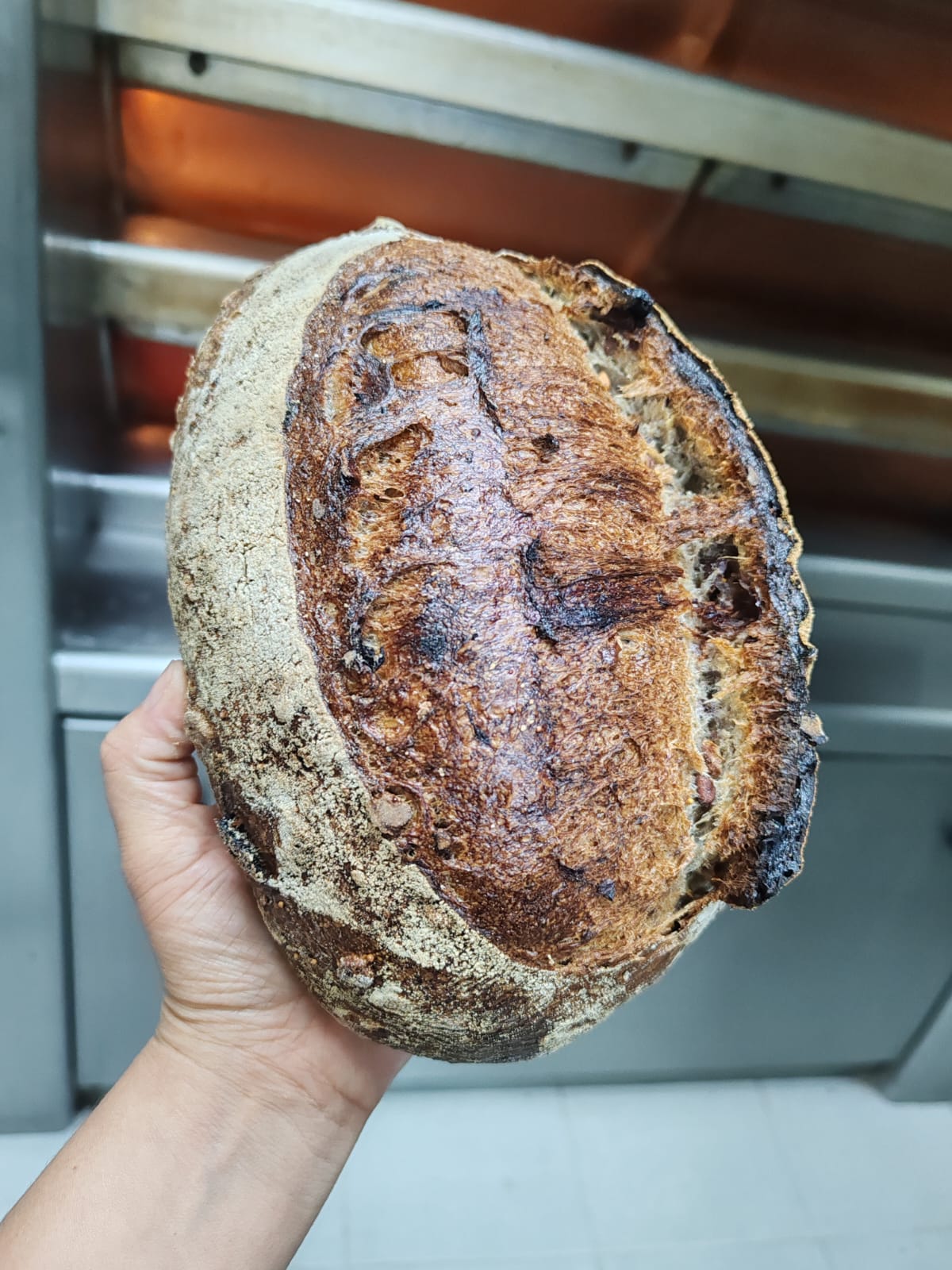 Pan de fermentación natural con harina de trigo y centeno, nueces, higo turco y arándanos.