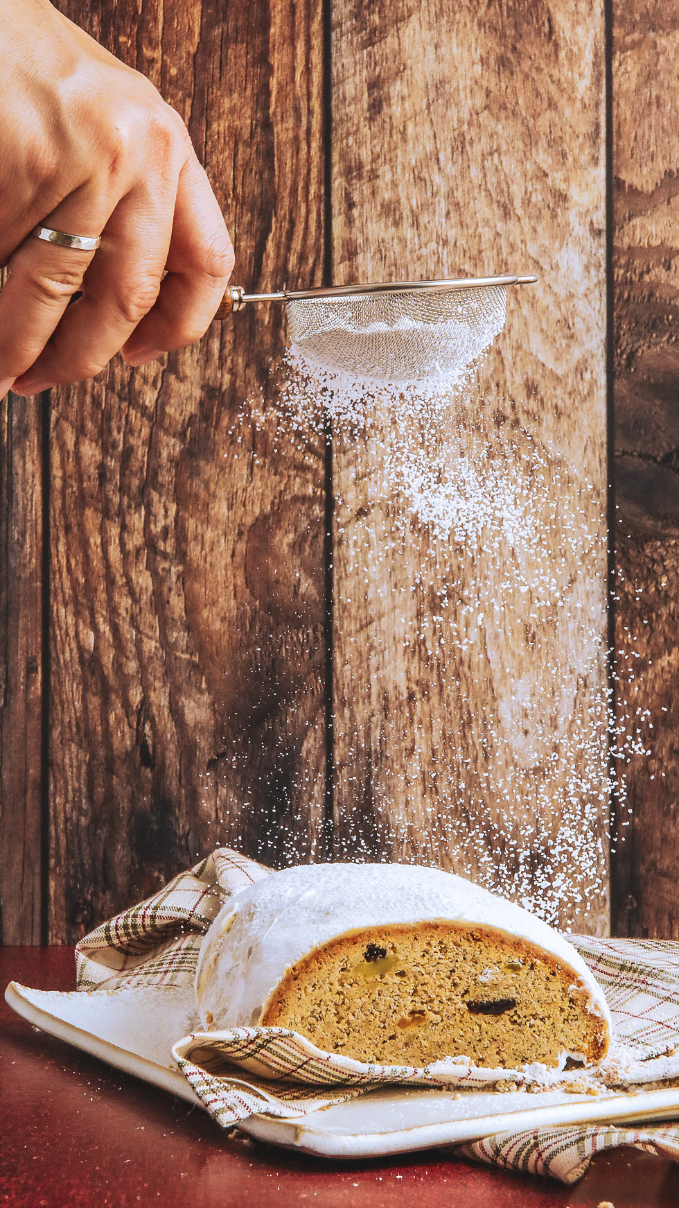 Nuestro Stollen está elaborado con harina de almendras, mantequilla, pasas, limón cristalizado y un toque aromático de cardamomo, todo macerado en ron para desarrollar un sabor profundo y tradicional.